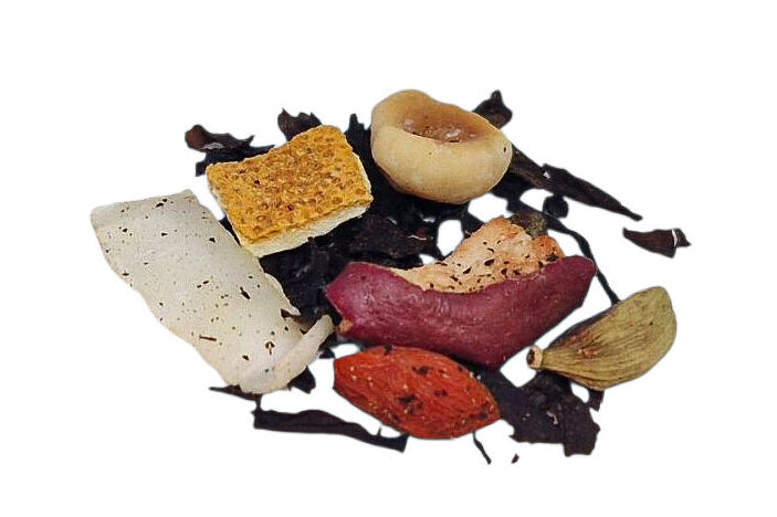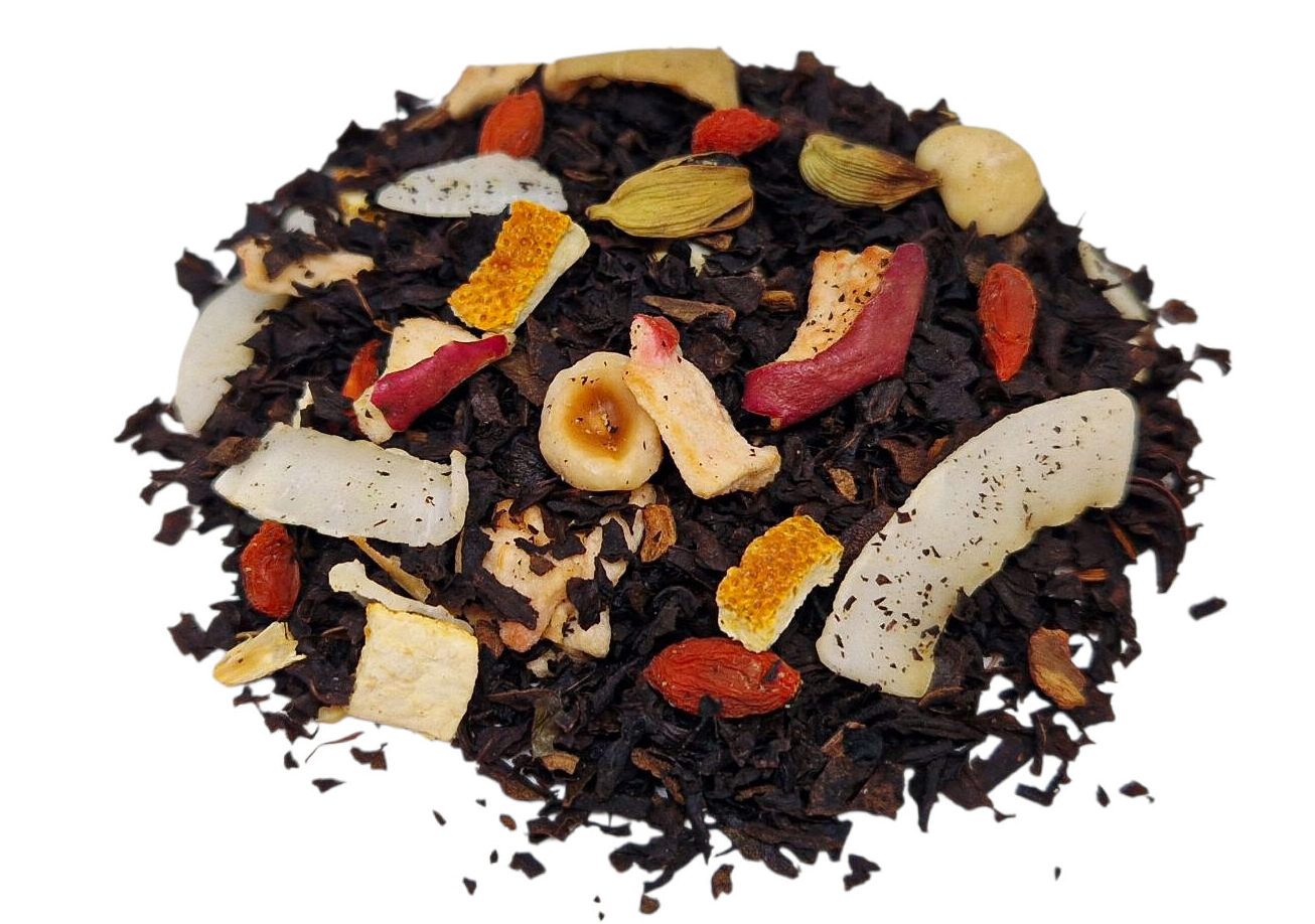 herbata czarna, cynamon, jabłko, skórka pomarańczy, kokos, orzech laskowy, owoc goji, kardamon, aromat